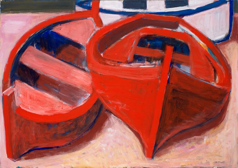 Nach den frühen realistischen Darstellungen von Booten während des Krieges in Rumänien wurden später Boote auf Ischia eines der Lieblingsmotive von Heiner Knaub. Besonderes reizten ihn die Farbigkeit und die symmetrischen Formen.