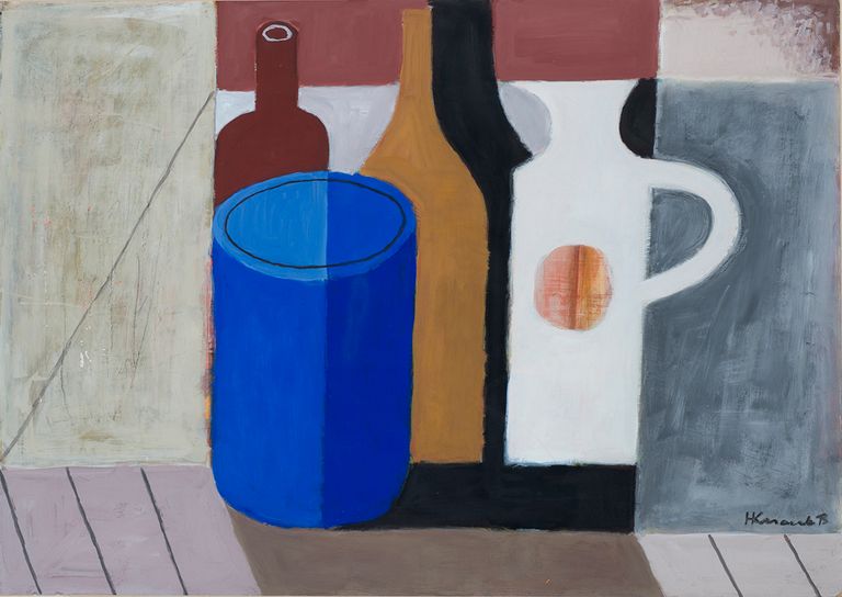 Stillleben schuf Heiner Knaub während seines gesamten künstlerischen Wirkens. Anfangs noch sehr konkret – Pflanzen,Vögel, Vasen -, wurden die Darstellungen später immer reduzierter und flächiger. Flaschen und Krüge wurden seine bevorzugten Motive.